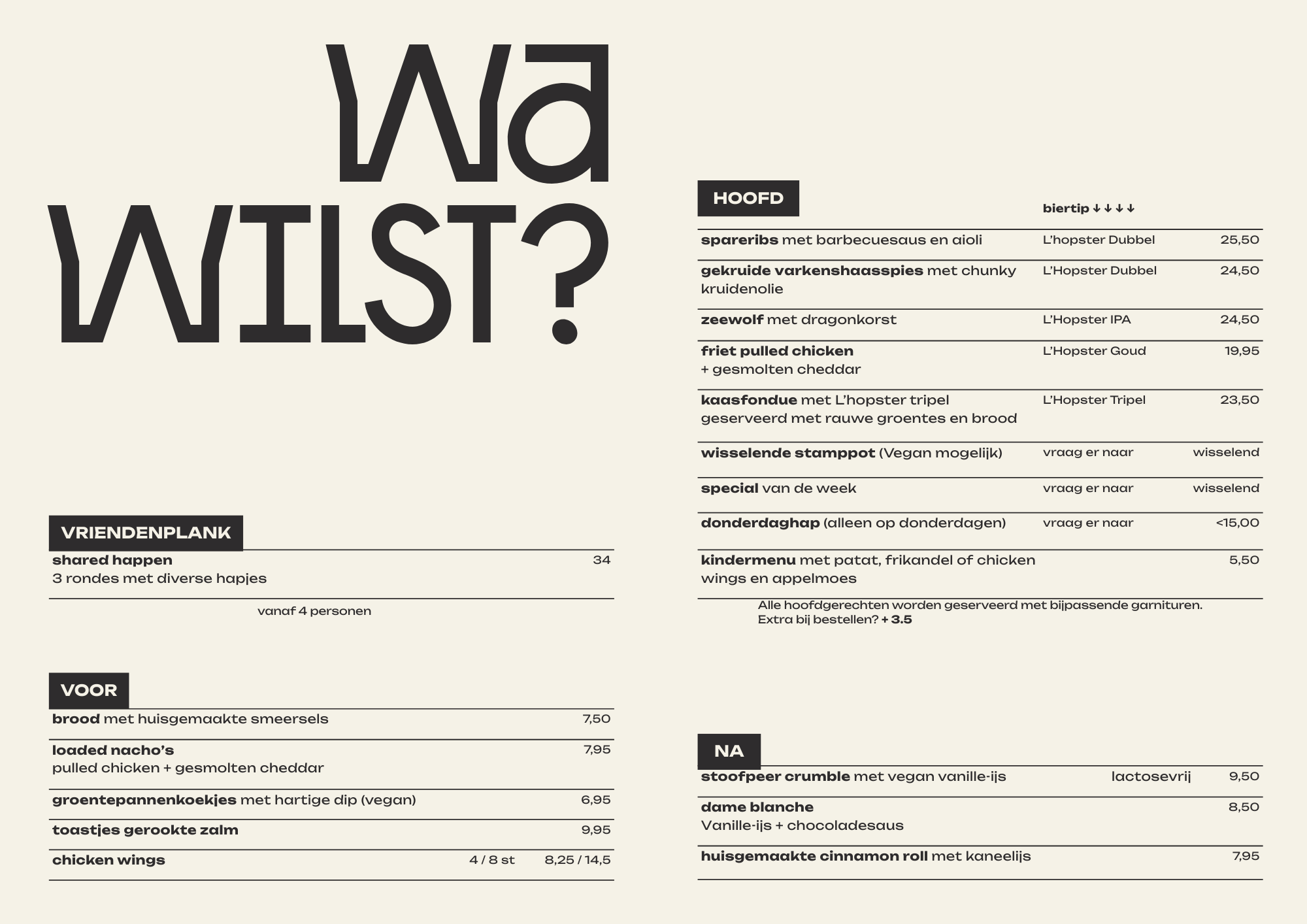 Of je nu komt borrelen met vrienden, trek hebt in pubfood of gewoon zin hebt in een bruine fruitschaal of Groningse worst – bij ons zit je goed. Denk aan goedgevulde borrelplanken om te delen, een daghap na een drukke werkdag of een stevige maaltijd met een goed glas bier erbij.